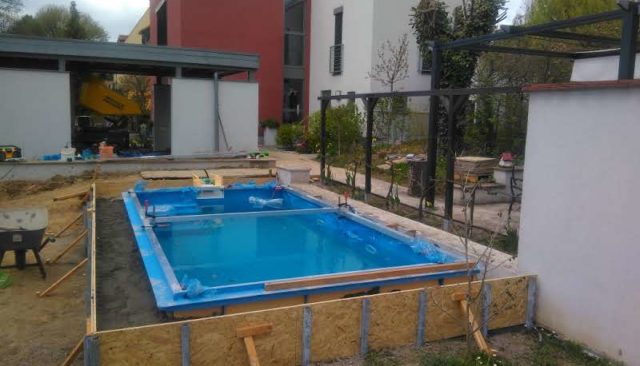 Besonderheiten: Maßanfertigung für kleinen Hinterhof, inkl. integriertem Technikschacht am Schwimmbecken, Leiter, Filteranlage, Lieferung komplett montiert