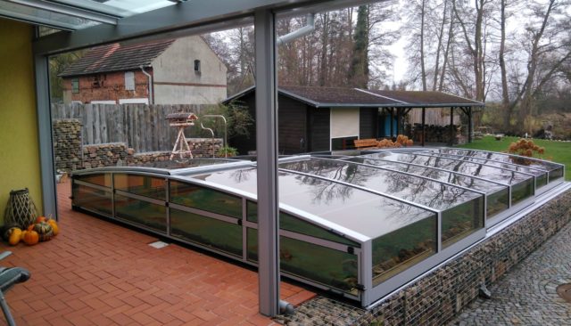 Pool-Überdachung: ALUKOV-Premium-Modell TERRA mit einseitiger Laufschiene