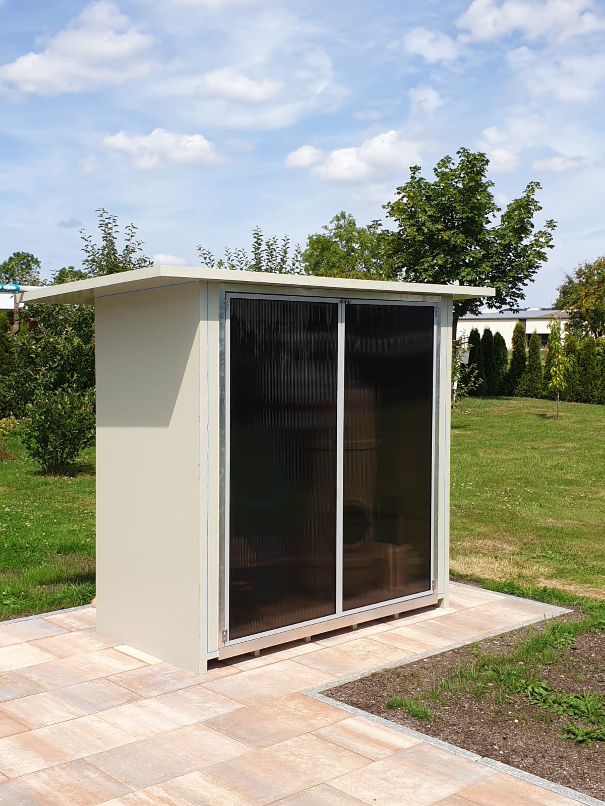 Hersteller/Modell: ALUKOV/VIVA mit einseitiger Laufschiene Besonderheiten: Profile: Silber, Verglasung: getöntes, kompaktes Polykarbonat, Klappe in einer Stirnseite, seitliche Schiebetür Vorarbeiten: tragfähige Unterkonstruktion als Montagefläche für Laufschienen in Gabionen eingearbeitet