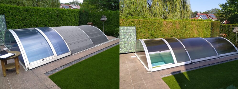 Pool-Überdachung: ALUKOV/Elegant mit geteilter Klappe in großer Stirnwand
